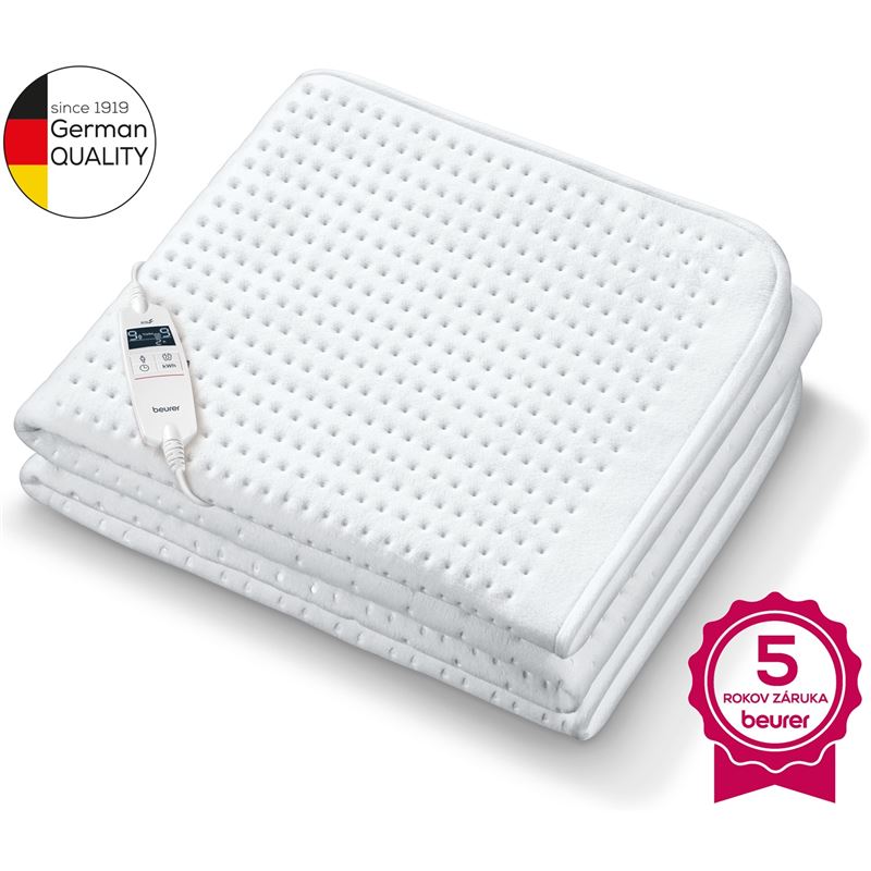 Elektrická napínacia vyhrievacia podložka BEURER UB101 má praktický tvar napínacej plachty, ktorý zabraňuje posúvaniu na matraci – ideálna, ak sa počas spánku veľa pohybujete. Vďaka bezpečnostnému systému Beurer ju môžete používať celú noc bez obáv z prehriatia. Podložku je navyše možné prať v práčke pri 30 °C. Doprajte si presne také teplo, aké potrebujete – samostatne pre telo aj nohy, s jednoduchým ovládaním cez podsvietený LCD displej.Charakteristika a technické údaje:Elektrická vyhrievacia podložka s praktickým tvarom plachtyVrchná strana: polyesterový velúr / spodná strana: objemový vliesBeurer bezpečnostný systém: monitorovanie teploty a ochrana proti prehriatiuMožnosť prania v práčke pri 30 °CPriedušný, hebký a k pokožke šetrný materiálLCD displej s nastavením teploty, časovača vypnutia, sledovania spotreby, režimu proti roztočom, rýchleho nahriatia a úsporného režimuECO režim: energeticky úsporné nastavenie teploty2 tepelné zóny: samostatné nastavenie teploty pre telo a nohy9 stupňov teploty pre telo aj nohyRýchle nahriatieVariabilné automatické vypnutie po 1-hodinových intervalochCertifikácia OEKO-TEX Standard 100Vyrobené v EurópeFarba: bielaDĺžka prívodného kábla: 2,3 mPripevnenie: tvar plachty (napínacia)Displej: LCD, podsvietený, čierne pozadie, biele číslice, rozmery 3,4 × 2,1 cm, výška číslic 2,1 cmPrevádzka zo siete: Vstup: 220-240 V; 50-60 Hz; 55-65 WRozmery: 198 x 92 cmHmotnosť (bez obalu): 1,88 kgZáruka: 5 rokovVýhrevné podložky nemeckej spoločnosti Beurer prinášajú príjemné teplo presne tam, kde je to potrebné. Keďže je používateľ v priamom kontakte so zdrojom tepla, podložka ohrieva konkrétnu časť tela, nie celú miestnosť. To znamená, že tepelné produkty sa dajú efektívne využiť a stratí sa menej energie. Pre dobrý spánok by mala byť izbová teplota okolo 18°C. Chladný vzduch a príjemne teplá podložka pod perinou Vám poskytujú ideálne podmienky pre spanie. Spánok je potom skutočné potešenie.