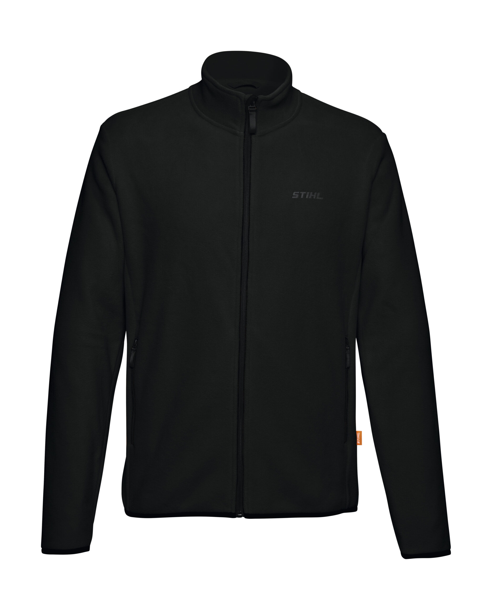 Čierna flisová bunda na zips, materiál: 100% polyester. Stojatý golier, dve bočné vrecká na zips, elastické oranžové lemovanie.