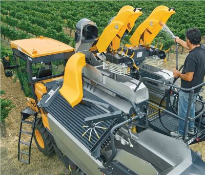 automatickým napínaním, s nadstavením výšky a rýchlosti, s rovnomerným rozdelením zberu v zásobníkoch, s dvoma spodnými ventilátormi + 1 na mycej platforme, 9 mazacích bodov (pre denné mazanie). Ďiaľkové ovládanie umožňuje otvorenie vrchných