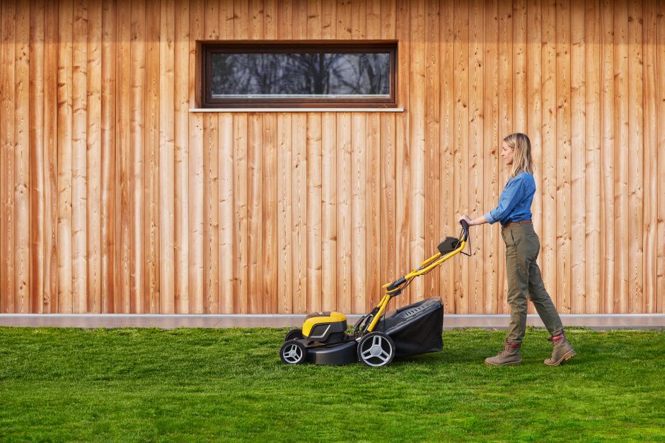 Kosačku je možné kompletne zložiť. Súčasťou balenie sú 2 batérie a nabíjačka. Výkon kosačky 1,5 kW.