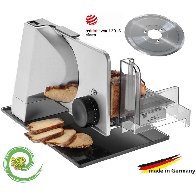 Multifunkčný krájač Ritter sinus 5 od nemeckej spoločnosti Ritter – štýlová súhra skla a nerezu, teraz aj v prevedení DUO PLUS – s hladkým nožom na krájanie šunky a syru.Celokovová konštrukcia krájača sinus5 ponúka vysoký stupeň stability a výkon pri krájaní.Integrovaná podlahová doska vyrobená z vysoko kvalitného nerozbitného skla dáva krájaču elegantný šmrnc.Za pútavý dizajn krájača sinus5 získal Red Dot Award: Produktový dizajn 2015.Závesná konštrukcia umožňuje nakrájané plátky potravín ukladať priamo na taniere a misky.Čepeľ z nerezovej ocele bola leštená elektrolyticky, čo vedie k veľmi hladkému povrchu a to aj na okraji.To znamená, že výsledky krájania sú ešte presnejšie a čepeľ je možné čistiť oveľa ľahšie.Krájač sinus5 je poháňaný výkonným a energeticky úsporným 65W eko motorom.Charakteristika a technickú údaje: závesná celokovová konštrukcia strieborná metalíza podlahová doska z odolného skla zúbkované ostrie, priemer 17 cm krytovaná čepeľ hrúbka rezu nastaviteľná až do cca. 23 mm bezpečnostný spínač pre prerušovaný alebo trvalý chod odnímateľný vozík úložný kábel produkt vyrobený v Nemecku 230 V, Eko-motor 65 W zabezpečí zníženie spotreby o 20% oproti predchádzajúcemu modelu, ale napriek tomu o 50% väčšiu účinnosť. pracovný cyklus 5 min šxvxh: 26 x 26 x 38 cm váha: 5,9 kg zúbkovaný nôž na chlieb a pečivo hladký nôž na šunku a syr sinus 5 – Red Dot Award 2015Štýlový celokovový multi krájač sinus 5 vďaka svojmu vynikajúcemu dizajnu získal ocenenie Red Dot Award: Product Design 2015. Tento rok bolo celkovo prihlásených 4 928 príspevkov z 56 krajín. „Red Dot“ je ocenenie od medzinárodného tímu odborníkov a je pečaťou kvality uznávanej po celom svete za výnimočný dizajn. Hodnotiacimi kritériami poroty sú okrem iného funkčnosť, životnosť, stupeň inovácie a ekologická kompatibilita.