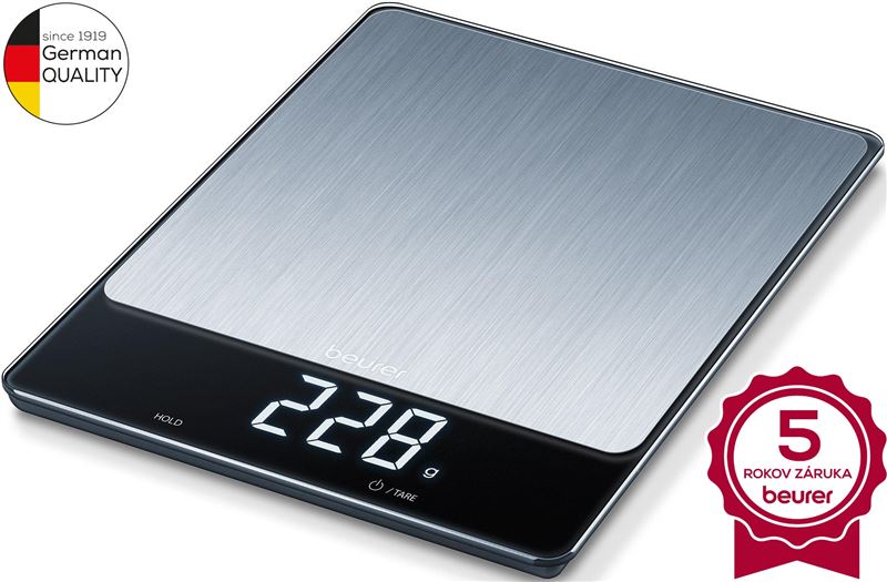 Kuchynská váha Beurer KS 34 XL nerez nie je iba elegantným kuchynským doplnkom s dizajnom z nehrdzavejúcej ocele ale hlavne vám pomocou nepretržitého zobrazovania hmotnosti pomáha aj pri vážení obzvlášť veľkých surovín. KS34 sa vyznačuje magickým LED displejom, ktorý sa zobrazuje iba počas merania. Mimoriadne vysoká hmotnostná kapacita 15 kg robí váhu obzvlášť praktickou pomocníčkou vo vašej kuchyni!Charakteristika a technické údaje: Funkcia Hold: nameraná hodnota zostane zobrazená na displeji aj po odobratí suroviny Anti-fingerprint: ľahko čistiteľná povrchová vrstva Moderné ovládanie pomocou dotykových tlačidiel Magic LED: displej sa objaví iba počas merania Funkcia Tara Veľkosť: 20 x 26,3 x 2,1 cm Kapacita: 15 kg Automatické vypnutie, indikátor preťaženia Veľkosť číslic: 25 mm Napájanie: 4 x 1,5 V AAA Veľkosť displeja: 9,5 x 2,5 cm Konverzia: g, kg, oz, lb: oz CE: áno    Vysoká presnosť, moderné spracovanie, to sú kuchynské váhy od nemeckej spoločnosti Beurer. Objavte najnovšiu generáciu kuchynských váh Beurer, ktoré vám ponúkajú presne tie funkcie, ktoré potrebujete. Váhy majú jedinečný dizajn a ponúkajú vysokú presnosť. Beurer KS 34 XL má mimoriadne veľkú kapacitu váženia a už tradične aj funkcie Tara a Hold. Moderná a vysoko spoľahlivá pomôcka do každej kuchyne!