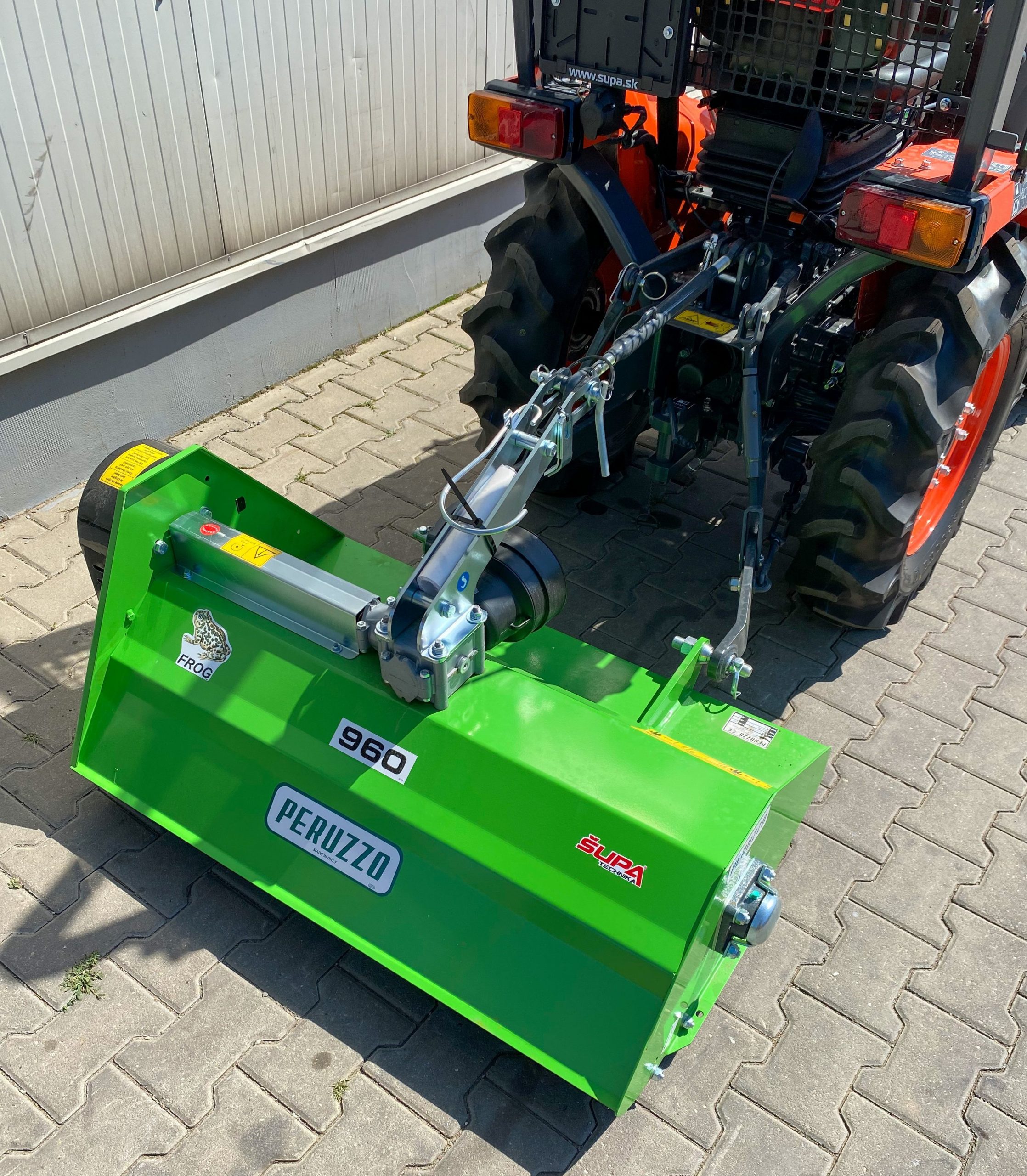 Nesený mulčovač Peruzzo Frog 960 pre zadnú agregáciu na nosiči, so šírkou pracovného záberu 96 cm. Mulčovač je vhodný pre ľahké traktory s 3-bodovým závesom kategórie I.