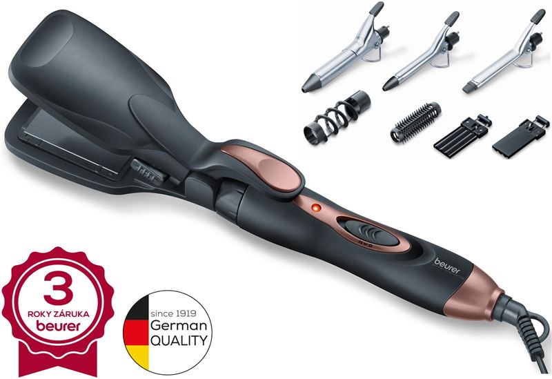 Ergonomický multifunkčný styler BEURER HT60 s keramickým povrchom žehliacich platní pre ochranu vlasov, ktoré sú príjemné na dotyk. Obsahuje 7 vymeniteľných nadstavcov, čím uľahčujú prácu pri úprave vlasov: hladké keramické kliešte 6 x 3 cm krepovacie keramické kliešte 6 x 3 cm tenké nerezové štipcové kliešte o 16 mm hrubé nerezové štipcové kliešte o 25 mm ploché nerezové štipcové kliešte 2 x 9 cm, hrúbka 1 cm nasúvací špirálový nadstavec pre vlnité vlasy nasúvací hrebeň o 3 cmPre bezpečnú manipuláciu slúži “Easy Lock” systém, ktorý ľahko uzatvára žehliace platne. Možné nastaviť 2 stupne teploty. Pre jednoduchú manipuláciu je vhodne využiteľný 360° otočný kábel. Navyše dobre poslúži aj závesné pútko pre uskladnenie.Charakteristika a technické údaje:7v1 multifunkčný styler pre každý štýlkeramický povrch žehliacich platní pre ochranu vlasov7 vymeniteľných nadstavcov- hladké keramické kliešte 6 x 3 cm- krepovacie keramické kliešte 6 x 3 cm- tenké nerezové štipcové kliešte o 16 mm- hrubé nerezové štipcové kliešte o 25 mm- ploché nerezové štipcové kliešte 2 x 9 cm, hrúbka 1 cm- nasúvací špirálový nadstavec pre vlnité vlasy- nasúvací hrebeň o 3 cm”Easy Lock” systém pre bezpečnú manipuláciuLED kontrolka2 stupňe teplotypovrch “soft touch” príjemný na dotyk360° otočný kábel pre jednoduchú manipuláciuergonomický tvarzávesné pútko pre jednoduché uskladneniepríkon: 25W