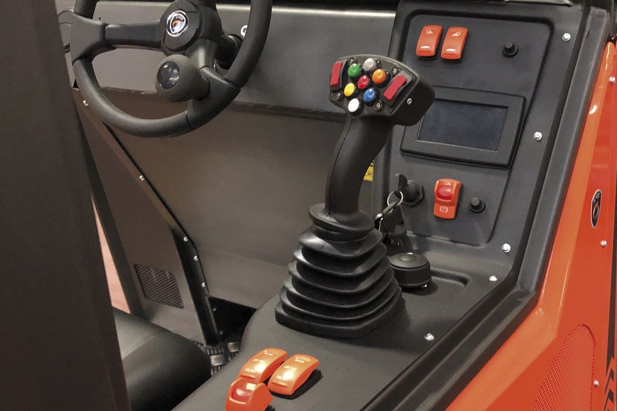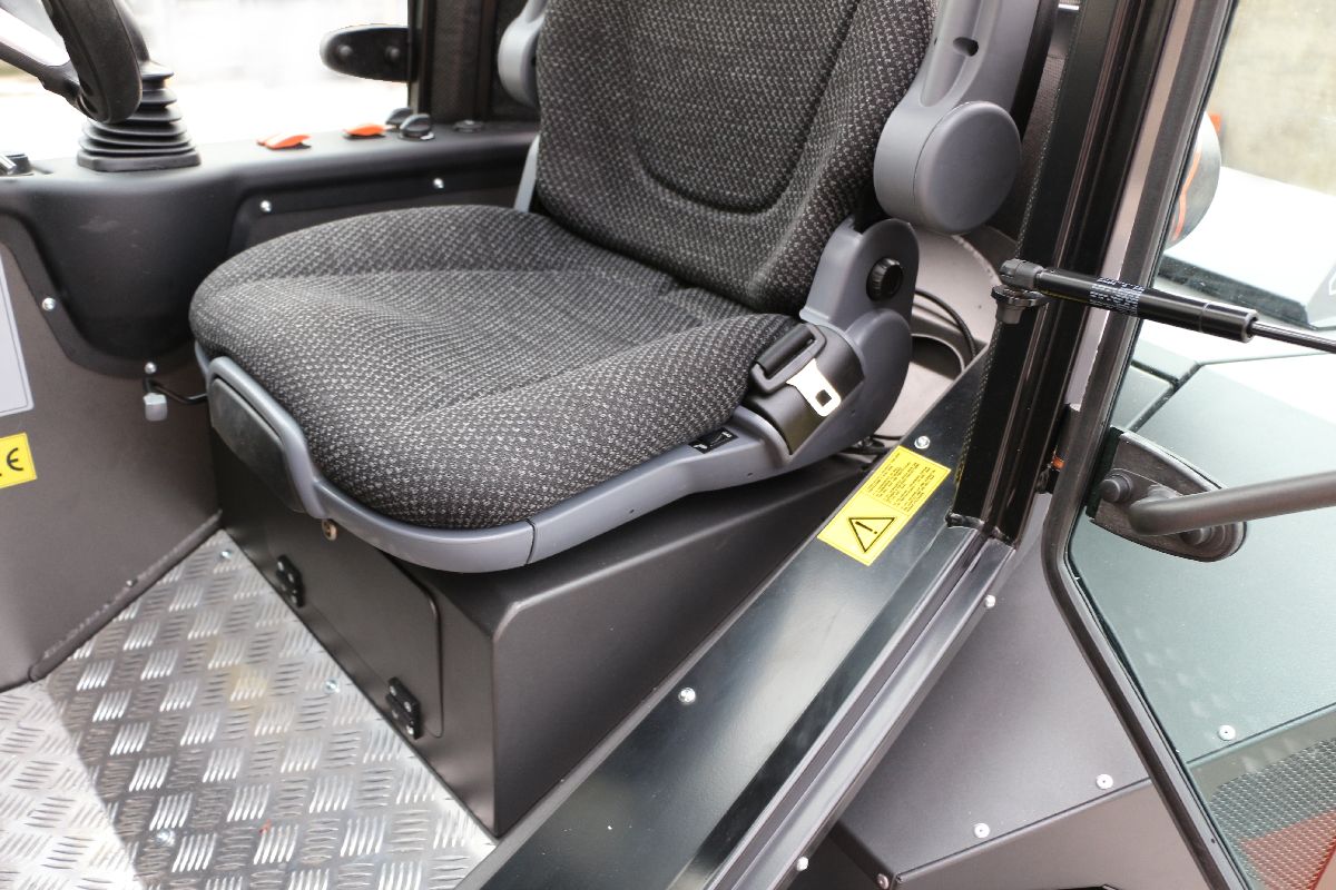 elektronického displeja. Nastaviteľné a pohodlné sedadlo je doplnené o lakťovú opierku a bezpečnostné pásy. Kabína je odhlučnená a môže byť vybavená