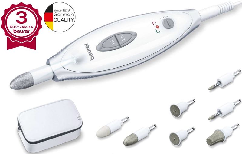 Manikúra/pedikúra BEURER MP 41 od nemeckého výrobcu Beurer je neoceniteľným pomocníkom žien, ktoré dbajú na svoju krásu a túžia byť upravené v každej situácii. Môžete si nastaviť 2 rýchlosti chodu a vybrať z až 7 zafírových nástavcov. Špecializované nástavce sú vhodné ako na úpravu nechtov na rukách a nohách ako aj na odstraňovanie zrohovatenej kože alebo odstránenie kurieho oka. Nechty si krásne opilníkujete, v prípade nechtov na nohách sa zbavíte nevzhľadnej hrubosti a následne povrch nechtov krásne vyleštíte aby bol hladký, jemný a závideniahodný. Okolie nechtov si ošetríte zafírovým kužeľom a už vám nič nebráni pochváliť sa vašim novým a krásnym ja.Charakteristika a technické údaje:pre profesionálnu starostlivosť o nechty rúk a nôhvýborná starostlivosť o ruky a nohys jasným svetlom LEDrýchlosť: 3.800 – 4.600 ot / min +/- 14%2 nastavenia rýchlostivýkonná sieťová prevádzka s prevodovkoubeží v smere hodinových ručičiek / proti smeru hodinových ručičieksúčasťou balenia: úložný vak7 zafírových nadstavcovKlikni video.