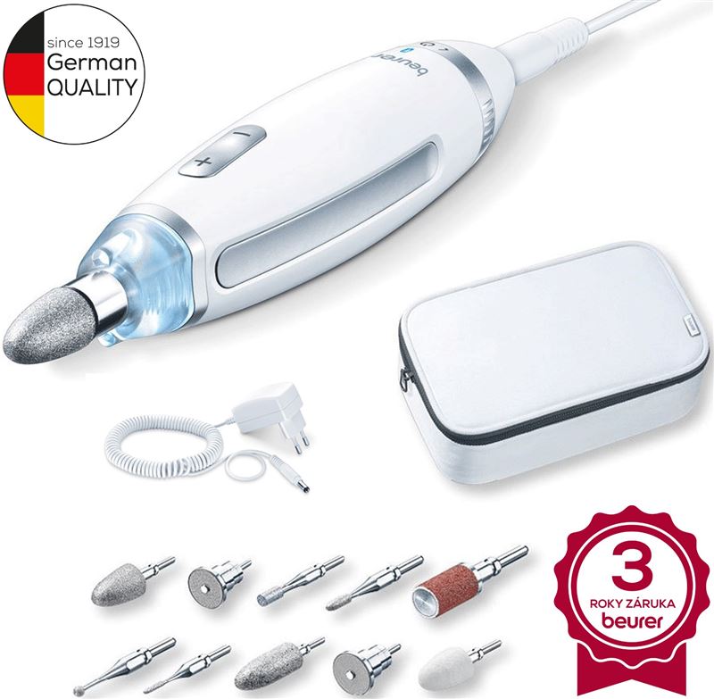 Profesionálna sada na manikúru a pedikúru Beurer MP 62 od nemeckej značky Beurer je určená pre každého kto chce profesionálnu starostlivosť o jeho ruky, nohy a nechty.S týmto prístrojom si veľmi ľahko ošetríte vaše nechty a kožu. Stvrdnutá pokožka okolo nechtov, polámané nechty, kožné nedokonalosti na prstoch, to všetko sa pre Vás stane minulosťou. Teraz budú vaše nechty, ruky a nohy vyzerať úžasne a reprezentatívne. Veľkou výhodou prístroja je jednoduché ovládanie a možnosť plynulého regulovania otáčok od 2000 do 5400 otáčok za minútu.Sada Beurer MP 62 obsahuje 10 kvalitných zafírových nástavcov. Nástavce sú vhodné napríklad pre vyhladenie, odstránenie a obrúsenie kože alebo nechtov. Ľavý a pravý chod sú ďalšou veľkou výhodou. Výborne sa tak dostanete aj do horšie prístupných miest. Beurer MP 62 využíva na prevádzku sieťovú prevádzku. Teraz budú vaše ruky a nohy profesionálne upravené z pohodlia vášho domova!10 zafírových nástavcov: zafírový kužeľ dlhý a hrubý zafírový kužeľ zafírový disk jemný zafírový disk filcový kužeľ valcová fréza rezací nástroj ihlový rezací nástroj zafírový nôž brusný papierCharakteristika a technické údaje: profesionálna starostlivosť o nechty a nohy S LED-svetlom otáčanie v smere hodinových ručičiek / proti smeru hodinových ručičiek plynulo nastaviteľné otáčky vrátane 10 zafírových nadstavcov ochranný kryt vhodné pre diabetikov manipulácia s mäkkým povrchom praktická schránka na ukladanie hlavná operácia s výkonným prevodom rýchlosť: 2 000-5 400 ± 20% otáčok za minútu vstup: 100-240V / 50/60 Hz výstup: 30 V / 250 mA / 7,5 WKlikni video.