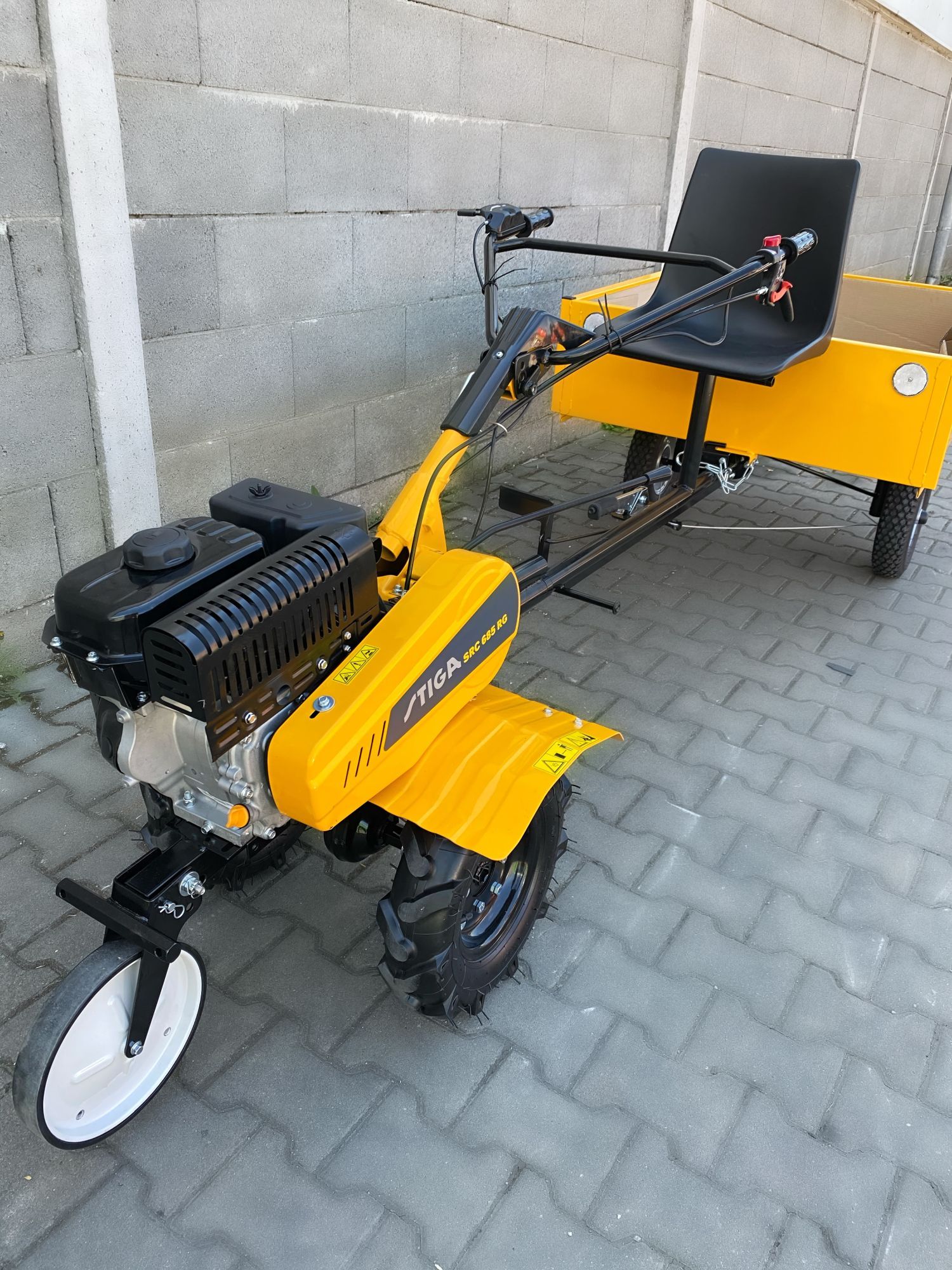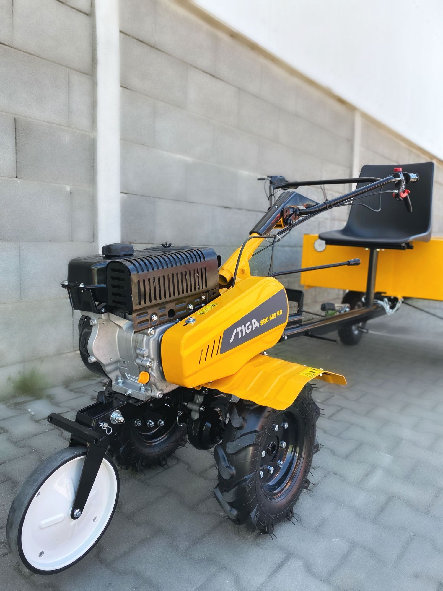 Malotraktor (rotavátor) STIGA SET SRCHV s benzínovým motorom s objemom 182 cm3, pracovným záberom 85 cm a hĺbkou 15 cm, s kypriacim ústrojenstvom a jedným predným kolesom.