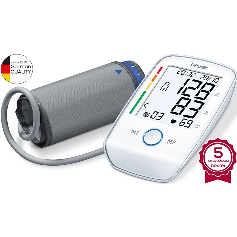 Plnoautomatický ramenný tlakomer od nemeckého výrobcu Beurer. Tento úžasný prístroj v sebe spája spoľahlivý monitor krvného tlaku a tepu. Disponuje krásnym na bielom podsvietením XL displejom s ľahko čitateľnými údajmi a tiež má dotykový senzor!Pre jednoduchú interpretáciu výsledkov merania tlaku tlakomer disponuje grafickou farebnou indikáciou (červené pole – vysoký alebo nízky tlak, zelené pole – normálny tlak)Charakteristika a technické údaje:tlakomer s meraním pulzu na ramenoautomatické meraniejednoduché použitie – ovládanie jedným tlačidlomveľký, podsvietený ľahko čitateľný LCD displejWHO klasifikáciedetekcia arytmiesignalizácia prevádzkových chýbpre obvod ramena 22 až 36 cm2x60 pamäťových miestautomatické vypínaniekontrolka batériepuzdrobatérie súčasťou balenia Ramenné tlakomery Beurer sú uznané pre ich presnosť, jednoduchosť použitia a cenovú dostupnosť a poskytujú kvalitu za dostupnú cenu každému, kto potrebuje kvalitný monitor krvného tlaku pre domáce použitie. Tlakomery Beurer sú určené na meranie a monitorovanie arteriálneho krvného tlaku na ramene. Meranie je veľmi jednoduché, vhodné úplne pre každého, doma i na cestách. Tlakomery Beurer sú prispôsobené prísnym požiadavkám a špecifikáciám smernice MDD 93/42 / EEC o zdravotníckych pomôckach a majú príslušnú značku CE.Sortiment ramenných tlakomerov Beurer je široký a pokrýva zariadenia od plne automatických jednoduchých modelov s jedným pamäťovým kanálom až po najkomplexnejšie moderné modely s duálnymi pamäťovými kanálmi a dotykovou obrazovkou. Zo širokého sortimentu si vyberie naozaj každý, presne podľa požiadaviek a okolností. Ramenné tlakomery Beurer môžu použiť ľudia všetkých vekových kategórií a môžu byť tiež veľmi užitočné pri starostlivosti o starších v domovoch dôchodcov.Ramenné tlakomery Beurer boli testované na presnosť a spoľahlivosť a boli označené značkou CE o zdravotníckych pomôckach podľa smernice MDD 93/42 / EEC o zdravotníckych pomôckach. Sú tiež v súlade s európskymi normami pre neinvazívne prístroje na meranie krvného tlaku EN1060-1 a EN1060-3. Tlakomery Beurer sú uznávané za najvyššiu kvalitu a presnosť na globálnom trhu zdravotnej starostlivosti. To je skrátka Beurer – prináša spoľahlivosť, presnosť, pohodlie a jednoduchosť použitia za prijateľnú cenu.Beurer – Najpredávanejšia značka tlakomerov na nemeckom trhu a druhá najpredávanejšia značka tlakomerov na svete.