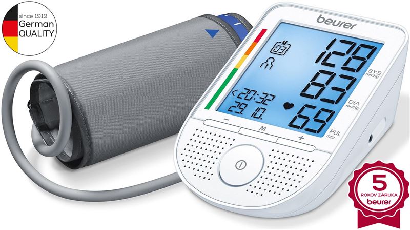 Unikátny plnoautomatický ramenný tlakomer od nemeckého výrobcu Beurer. Tento úžasný prístroj v sebe spája spoľahlivý monitor krvného tlaku a tepu s hlasovou funkciou! Dokáže teda interpretovať výsledky nielen na displeji ale aj zvukovou formou v niekoľkých jazykoch, dostupná je aj čeština!Pre jednoduchú interpretáciu výsledkov merania tlaku tlakomer disponuje grafickou indikáciou (červené pole – vysoký alebo nízky tlak, zelené pole – optimálny tlak)Charakteristika a technické údaje:tlakomer / pulzomer na ramenofunkcia hlásenia hodnoty v 15 jazykoch, vrátane CZnastavenie hlasitosti hláseniahlasovú funkciu možné úplne vypnúťveľký ľahko čitateľný displej2 x 60 pamäťových miestvýpočet priemernej hodnoty za posledných 7 dníklasifikácia hodnôt vo farebnej škáledetekcia arytmiepre obvod ramena 22 – 36 cmfunkcia automatického vypnutiazobrazenie dátumu a časupraktické púzdroindikácia stavu batérieRamenné tlakomery Beurer sú uznané pre ich presnosť, jednoduchosť použitia a cenovú dostupnosť a poskytujú kvalitu za dostupnú cenu každému, kto potrebuje kvalitný monitor krvného tlaku pre domáce použitie. Tlakomery Beurer sú určené na meranie a monitorovanie arteriálneho krvného tlaku na ramene. Meranie je veľmi jednoduché, vhodné úplne pre každého, doma i na cestách. Tlakomery Beurer sú prispôsobené prísnym požiadavkám a špecifikáciám smernice MDD 93/42 / EEC o zdravotníckych pomôckach a majú príslušnú značku CE.Sortiment ramenných tlakomerov Beurer je široký a pokrýva zariadenia od plne automatických jednoduchých modelov s jedným pamäťovým kanálom až po najkomplexnejšie moderné modely s duálnymi pamäťovými kanálmi a dotykovou obrazovkou. Zo širokého sortimentu si vyberie naozaj každý, presne podľa požiadaviek a okolností. Ramenné tlakomery Beurer môžu použiť ľudia všetkých vekových kategórií a môžu byť tiež veľmi užitočné pri starostlivosti o starších v domovoch dôchodcov.Ramenné tlakomery Beurer boli testované na presnosť a spoľahlivosť a boli označené značkou CE o zdravotníckych pomôckach podľa smernice MDD 93/42 / EEC o zdravotníckych pomôckach. Sú tiež v súlade s európskymi normami pre neinvazívne prístroje na meranie krvného tlaku EN1060-1 a EN1060-3. Tlakomery Beurer sú uznávané za najvyššiu kvalitu a presnosť na globálnom trhu zdravotnej starostlivosti. To je skrátka Beurer – prináša spoľahlivosť, presnosť, pohodlie a jednoduchosť použitia za prijateľnú cenu.Beurer – Najpredávanejšia značka tlakomerov na nemeckom trhu a druhá najpredávanejšia značka tlakomerov na svete.