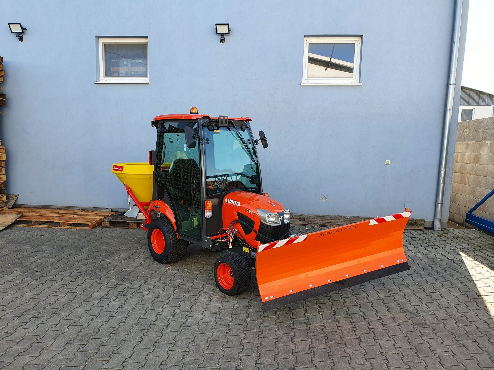 Traktor Kubota BX261-zimný set, ktorý obsahuje traktor, kabínu, kúrenie, predné hydraulické ramená, joistik na ovládanie zdvihu a natáčania radlice, prednú radlicu na sneh o zábere 1200 až 1600 m podľa vlastného výberu a rozmetadlo na komunálny posyp