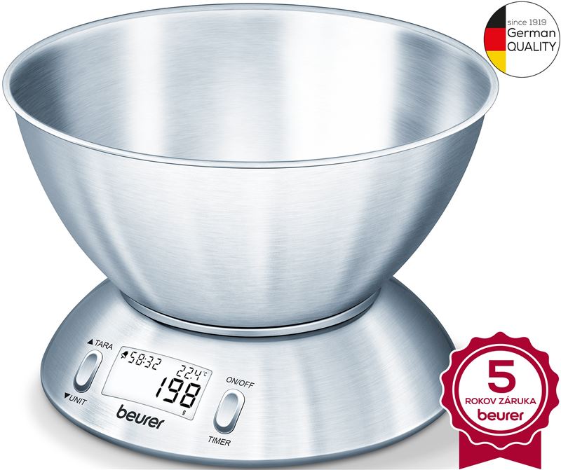 Kuchynská váha Beurer KS54 s veľkou miskou z brúsenej nehrdzavejúcej ocele je dokonalým spoločníkom v kuchyni. Ponúka kapacitu až 5kg s presnosťou 1g. Integrovaný teplomer a časovač je ďalším vrcholom váhy. Vďaka sledovaniu času a okolitej teploty si môžete byť istý, že pripravované cesto Vám krásne vykysne. S týmto výborným pomocníkom sa stanete majstrom pri varení a pečení!Charakteristika a technické údaje:Veľká nerezová miska 1,5lFunkcia časovačaIntegrovaný izbový teplomerFunkcia TARAAutomatické vypnutie, indikátor preťaženiaNádoba vhodná do umývačky riaduVeľkosť číslice: 10 mmBatérie: 2×1,5V AAA batérieVeľkosť displeja: 4,6×2,2 cmRozmery výrobku: 19×5,8 cmVeľkosť misy: 21,3×9,3 cmNosnosť / presnosť: 5 kg / 1 gKonverzia: g, ozCE: ánoObjavte najnovšiu generáciu kuchynských váh nemeckej značky Beurer, ktoré vám ponúkajú presne tie funkcie, ktoré potrebujete. Váhy majú jedinečný dizajn a ponúkajú vysokú úroveň presnosti. Vstavané časovače či teplomery vám poskytujú podporu, ktorú pri varení potrebujete.