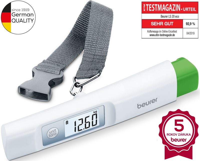 Váha na batožinu Beurer LS 20 eco je základom pre služobné cesty či dovolenku. Vďaka malej, ľahkej batožinovej váhe Beurer okamžite viete, či je hmotnosť vašej batožiny stále v predpísaných medziach. Keď sa vraciate domov z cesty, určite máte vo svojej batožine niekoľko suvenírov a darčekov pre svojich blízkych. Váha Beurer LS20 dokonca nepotrebuje ani batérie!Charakteristika a technické údaje: Ideálne na cestovanie leteckou dopravou: už žiadne poplatky za nadváhu batožiny Vždy pripravená na použitie – nie sú potrebné žiadne batérie Batožinová váha bez batérií – výkon dynama (patentovaná technológia) Funkcia automatického podržania S upínacím popruhom pre úsporu miesta Jednoduché čítanie displeja, veľkosť číslic: 11,5 mm Vhodné aj na váženie iných predmetov Technológia zapnutia: výkon dynama Automatické vypnutie, indikátor preťaženia Kapacita merania hmotnosti: do 50 kg Dĺžka šnúrky: 15,1cm Rozmery výrobku: 17,3 x 2,8 x 3,5 cm CE: Áno S praktickými batožinovými váhami od nemeckej značky Beurer bude organizácia vašej batožiny pred cestou jednoduchosťou. Rozlúčte sa s prebaľovaním batožiny alebo platením za nadmernú hmotnosť batožiny. Začnite svoju cestu na vysokej úrovni! ETM Testmagazin testovali našu váhu na batožinu LS 20 ecoNaša najnovšia batožinová váha LS 20 eco bola testovaná spoločnosťou ETM Testmagazin a získala ocenenie VEĽMI DOBRÉ 92,9%!