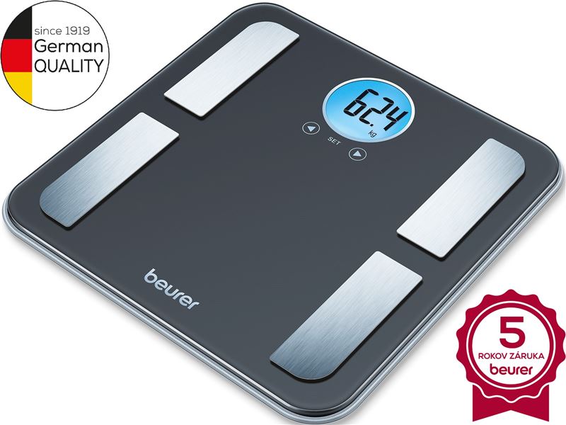 Osobná diagnostická váha Beurer BF 220 od nemeckej spoločnosti Beurer je určená pre všetkých milovníkov čístého dizajnu v kombinácií skla a nerezu. Váha má XL važiacu plochu 31 x 31 cm, ktorá je tvorená 8 mm hrubým bezpečnostným sklom. Navyše má na modro podsvietený okrúhly displej – úžasne čitateľný. Váha ďalej ponúka 5 úrovní aktivity a 10 užívateľských pamätí. Kapacita je úžasných 180 kg!Dostatočné cvičenie, zdravá výživa a hmotnosť, pri ktorej sa dobre cítite – sú nevyhnutné pre vaše zdravie. Široký sortiment váh od osobných digitálnych, cez dizajnové váhy až po diagnostické váhy. Tie všetky Vám pomôžu dosiahnuť alebo udržiavať zdravú hmotnosť.Hmotnosť je problémom zdravia. Veľa ľudí má nadváhu. Je to spôsobené zmenou okolností, menej fyzických aktivít alebo nadbytok vysoko kalorických potravín. Avšak podváha je tiež rizikovým faktorom. Pravidelná kontrola hmotnosti je preto veľmi dôležitá.Charakteristika a technické údaje: atraktívny, guľatý LCD displejna modro podsvietený displejmoderné prevedenie – rámy28 mm výška číslicvážiaca plocha z bezpečnostného sklaelektródy z brúsenej ušľachtilej ocelemeranie telesnej hmotnosti, tuku, vody, hustota svalovej, kostnej hmoty, kalórie (AMR)- 0,1% analýza telesného tuku, vody a svalovej hustoty- 100 g telesnej hmotnosti a kostnej hmotyjednotky kg / lb / st10 užívateľských pamätí5 úrovní aktivityautomatické zapnutie a vypnutierozmer 30 x 30 cmkapacita: 180 kgpresnosť: 100 gindikácia preťaženia