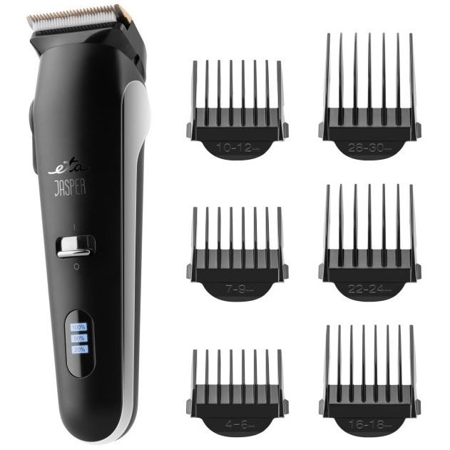 Nepotrebujete drahé návštevy salónu, aby ste vyzerali skvele. S praktickým zastrihávačom vlasov a fúzov ETA Jasper máte všetko, čo potrebujete na každodennú úpravu – rýchlo, pohodlne a s výsledkom, na ktorý sa môžete spoľahnúť.Vyberateľná hlava s titánovo-keramickým ostrím zabezpečuje hladké a presné zastrihnutie vlasov aj fúzov. Bez hrebeňových nadstavcov si môžete nastaviť dĺžku strihu od 0,7 do 2,5 mm, so šiestimi priloženými nadstavcami až do 30 mm si ľahko prispôsobíte štýl podľa nálady či potreby.Silný motor sa postará o plynulý chod a kvalitná Li-Ion batéria poskytne až 60 minút prevádzky po 2,5 hodinách nabíjania. Či už ste doma alebo na cestách, zastrihávač ETA Jasper je vždy pripravený do akcie.Charakteristika a technické údaje:Li-Ion akumulátor 3,7 V (1100 mAh)doba nabíjania 2,5 hod.doba prevádzky 60 min.odnímateľná hlava s titánovo-keramickým ostrímmožnosť použitia bez hrebeňových nadstavcov: 0,7 / 1,3 / 1,9 / 2,5 mmsieťové aj AKU použitieUSB nabíjanieLED displej s indikáciou zostávajúcej doby prevádzky v %, dobíjania a nabitiaPRÍSLUŠENSTVO: 6 hrebeňových nadstavcov (4–6 mm, 7–9 mm, 10–12 mm, 16–18 mm, 22–24 mm, 28–30 mm), ochranný kryt, čistiaci štetec, olej, USB-C kábel (adaptér nie je súčasťou balenia)farba: čiernaDisplej zastrihávača ETA Jasper zobrazuje zostávajúci čas prevádzky v percentách aj aktuálny stav nabitia. Praktické tlačidlo, ergonomický tvar a jednoduché ovládanie robia z tohto zastrihávača ideálneho pomocníka na každodenné použitie. Nabíjať ho môžete cez USB kábel (1 m), pričom samozrejmosťou je aj možnosť sieťovej prevádzky.Súčasťou balenia je čistiaci štetček, olej na britvy a cestovné vrecko.